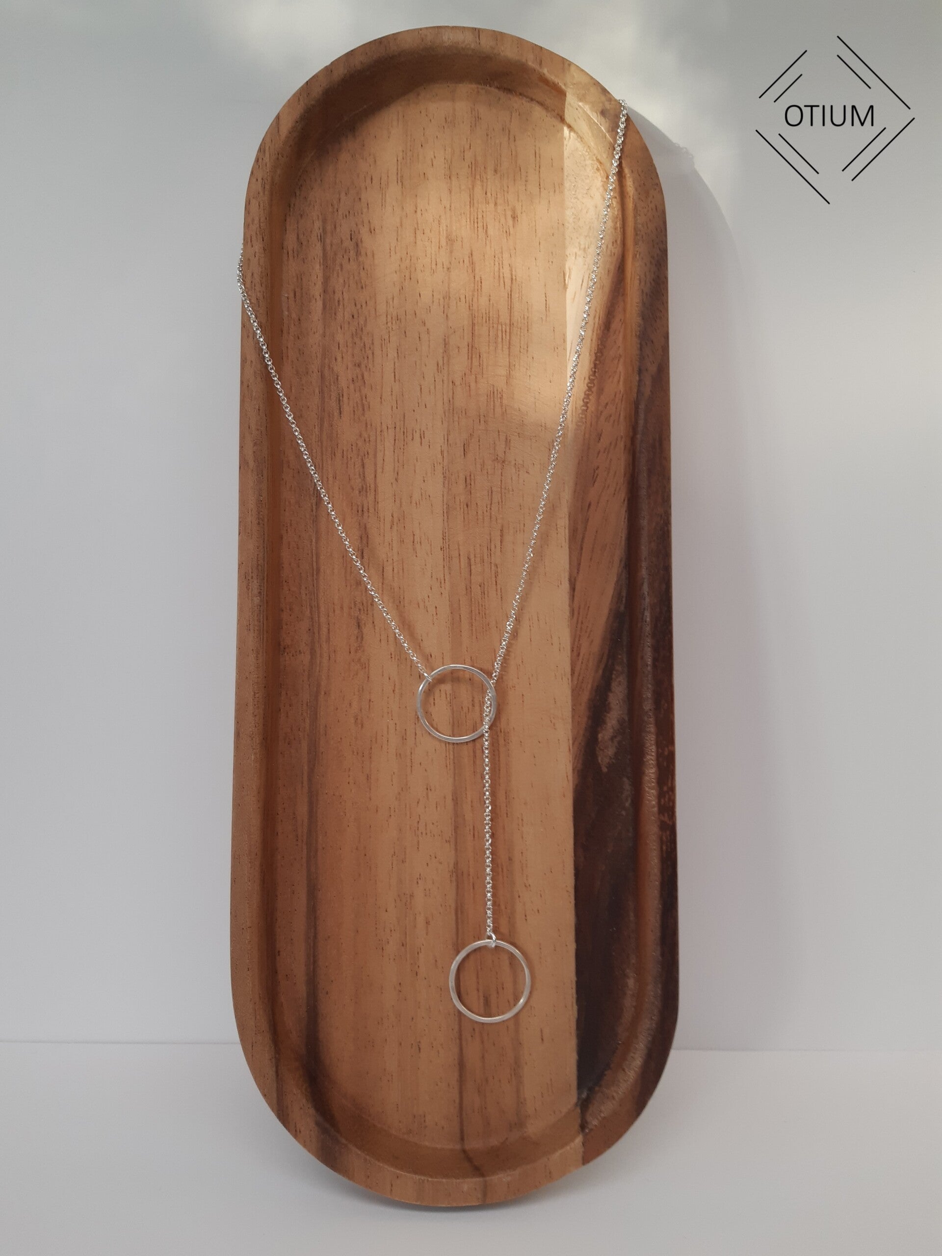 Een halsketting met twee verbonden circels in 925 sterling zilver. Hou jij van eenvoud maar ook van lijnen en vormen in beweging? Dan is dit een ontwerp dat bij jou past.
